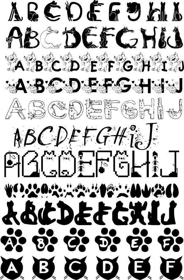 Здесь можно быстро и бесплатно, скачать 11 шрифтов с кошками (кошачьи шрифты), образцы шрифтов представлены ниже, здесь есть шрифт в виде лапок, буквы в форме кошек, или буквы с кошками рядом, в общем шрифты с кошками на любой вкус. Один дополнительный шрифт - лапки различных животных. (04.11 1:40)