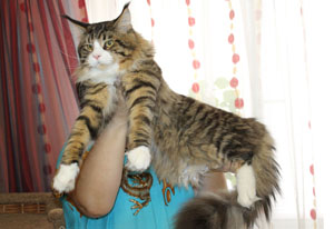 Мейн кун – порода полудлинношерстных кошек поражающая своими поистине гигантскими размерами среди домашних сородичей. Вес представителей этой породы может достигать 12 кг у самцов и 7 кг у самок. Длина тела у них при этом нередко превышает метровую отметку. Кисточки на ушах делают эту кошку похожей на рысь, а длинный пушистый хвост – на енота. (03.11 21:12)